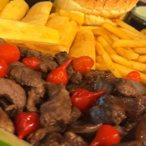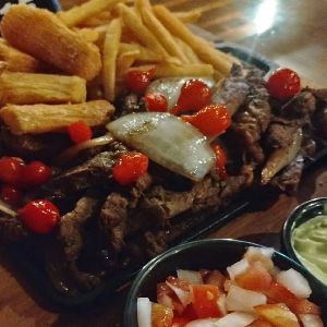 INTEIRA: 500g de Filé Mignon; 250g de Batata; 250g de Mandioca. MEIA: 250g de Filé Mignon; 250g de Batata; 250g de Mandioca. ACOMPANHA: Molho verde; Pão; Vinagrete.